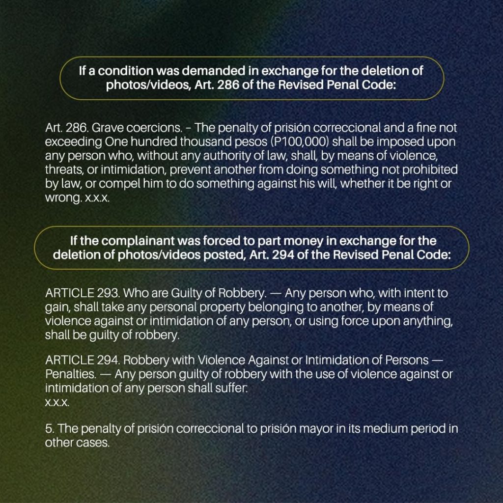 •If a condition was demanded in exchange for the deletion of photos/videos, Art. 286 of the Revised Penal Code